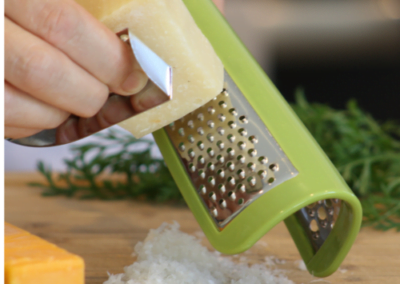 • GRATING & ZESTING HAVE NEVER BEEN SO SIMPLE AND SAFE: Grate the hardest or softer cheeses or hard chocolate/carrots and create small or bigger pieces with one tool. The smaller holes make creating smaller parmesan fluff, citrus zest, chocolate shavings or grated ginger/garlic or nutmeg a breeze. The SAFEGRATE will hold any size food to grate on the 2 sided 2GRATE in a safer and easier way and both products are left and right handed friendly.