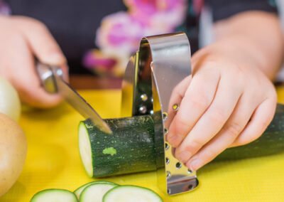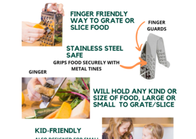 • GRATERS FOR KITCHEN CAN BE DANGEROUS and the SAFEGRATE grater hand guard is the finger-friendly way to grate or slice food. With a stainless steel finger guard protecting your hands and fingers and metal tines that securely hold your food for a superior grip, you don’t have to worry about nicks or plastic getting in your food. Our slicing guard is even kid-friendly for children as young as 4!