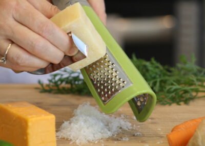 • GRATING & ZESTING HAVE NEVER BEEN SO SIMPLE AND SAFE: Grate the hardest or softer cheeses or hard chocolate/carrots and create small or bigger pieces with one tool. The smaller holes make creating smaller parmesan fluff, citrus zest, chocolate shavings or grated ginger/garlic or nutmeg a breeze. The SAFEGRATE will hold any size food to grate on the 2 sided 2GRATE in a safer and easier way and both products are left and right handed friendly.
